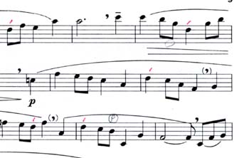 ここから軟口蓋を意識して吹くように言われて吹き出しますと、5個目に苦手な Middle-D がちらっと目に入ります、なにせ赤マークを付けているくらいですから(笑)。