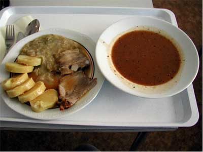 右側は「グラーシュ」というスープ。 このスープの種類が半端ではありません。 左側の輪切りのパンは、ジャガイモ入り蒸しパン。